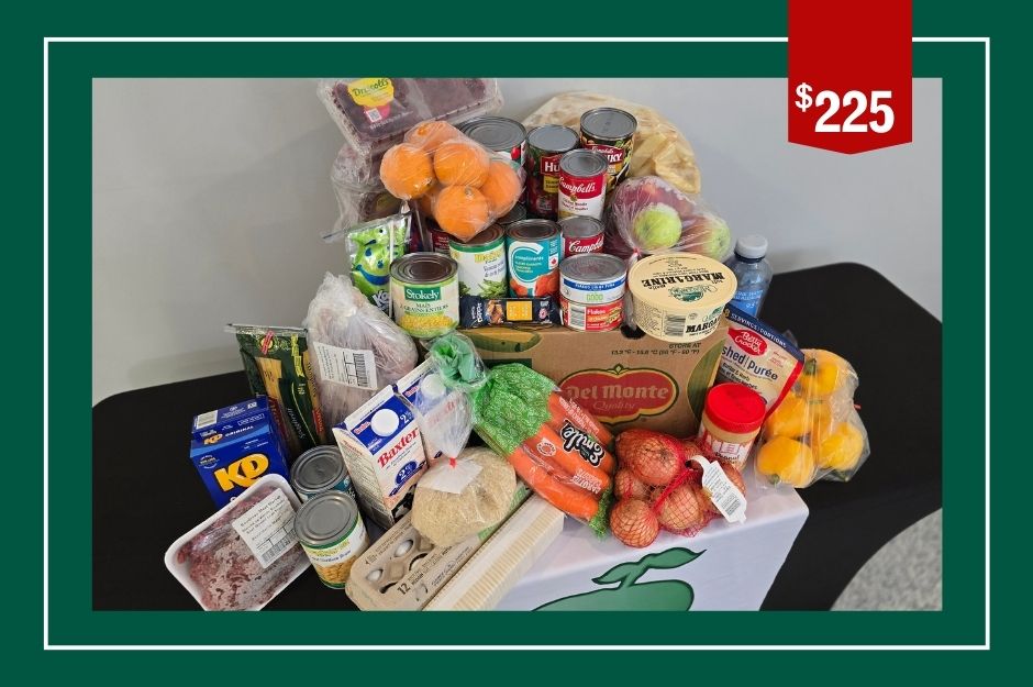 Provide a grocery box for a family of four which includes non-perishables (canned soup, canned vegetables, canned beans, dry pasta, crackers, rice), perishables (milk, eggs, meat, produce) and choice items.