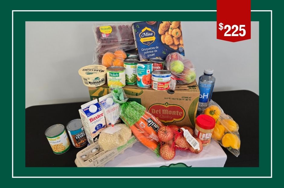 Provide a grocery box for a family of four which includes Halal non-perishables (canned soup, canned vegetables, canned beans, dry pasta, crackers, rice), perishables (milk, eggs, Halal meat, produce) and choice items.
